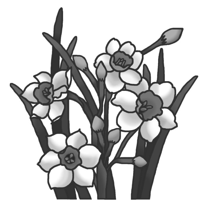 スイセン(水仙)モノクロ/冬の花2/花のイラスト こちらの画像をDLして下さい。縦・横同じ比率で縮小して、お好きな大きさでお使い下さい。 PCの画面上は大きく見えますが実寸は、はがきに収まるサイズです。