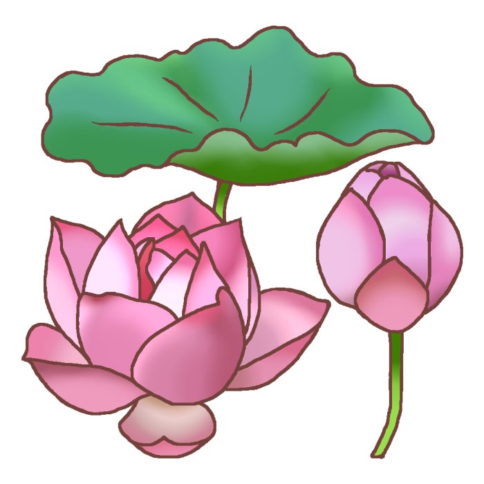 ハス1(蓮)カラー/夏の花1/花のイラスト こちらの画像をDLして下さい。縦・横同じ比率で縮小して、お好きな大きさでお使い下さい。 PCの画面上は大きく見えますが実寸は、はがきに収まるサイズです。